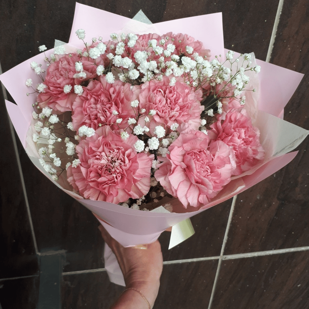 Букет из диантусов и гипсофилы подарит хорошее настроение и порадует любого получателя.