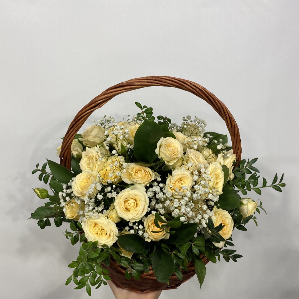Корзина с цветами «Дивный сад» из роз и гипсофил