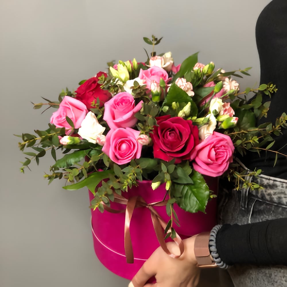 Шляпная коробка с цветами «Для самой любимой» из роз и гвоздик