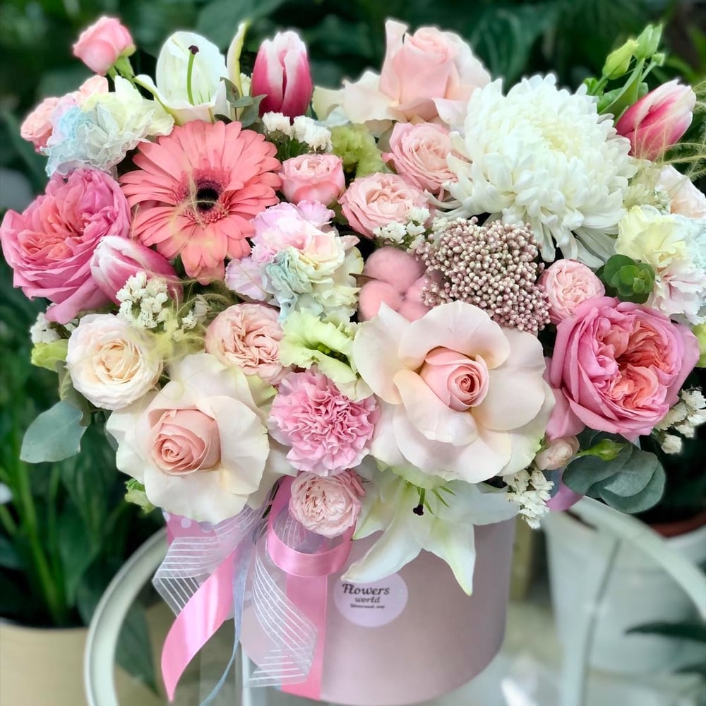Коробка с цветами «Для любимых глаз» из гвоздик и тюльпанов