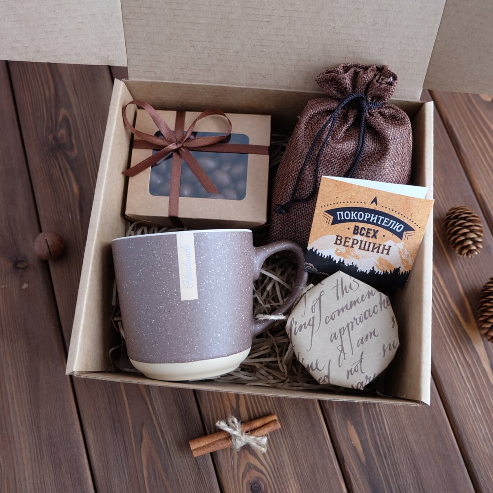 В наборе: 📌Коробка 20*20*9 см 📌Фруктовый чай в холщовом мешочке 📌Кружка 400 мл 📌Мёд-суфле 120 гр (вкусы разные) 📌Арахис в темном шоколаде 📌Открытка