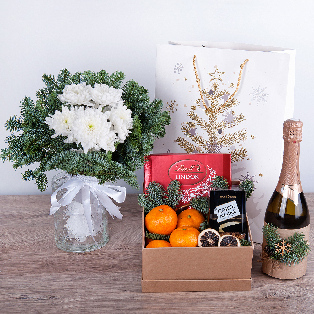 Долгожданный подарок с безалкогольным шампанским из хризантем