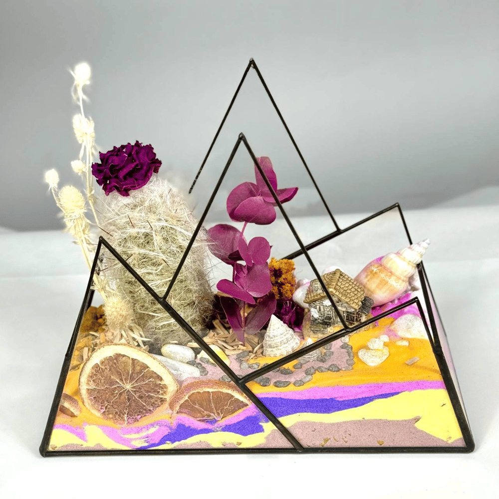 В этом флорариуме спрятан целый мир, где время остановилось на самом красивом моменте заката. Разноцветные пески напоминают яркие дюны, среди которых уютно устроился крошечный домик. Необычный пушист…
