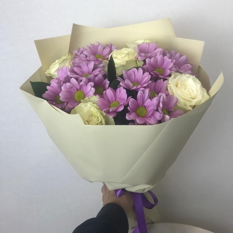 Белые розы и хризантемы – соединенные в одном букете, цветы означают гармоничную любовь и единство двух влюблённых.