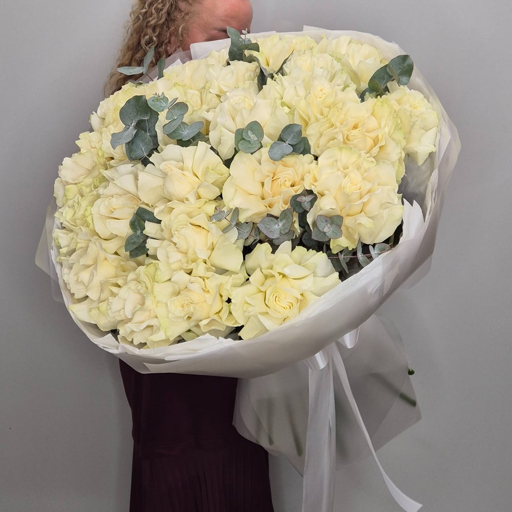Букет, в котором королева цветов белая роза встречается с аристократом флористики эвкалиптом. Лаконично, стильно и невероятно эффектно.