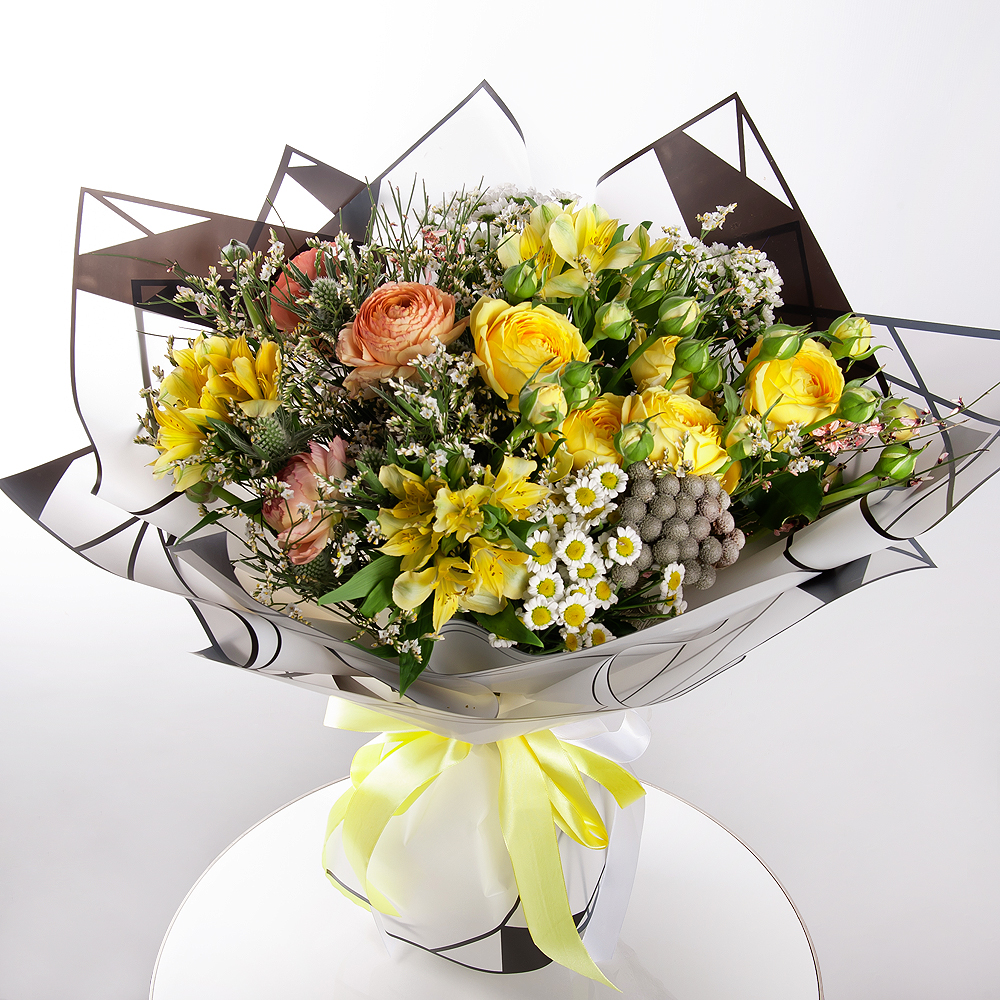 В этом букете – настоящая экзотическая феерия ярких пионовидных роз вместе с хризантемами, ранункулюсами и альстромериями. Эрингиум, бруния, лимониум и гениста делают букет еще более ярким и эффектным. Современная упаковка подчеркивает красоту и уникальность этой композиции, идеально передавая ваши чувства