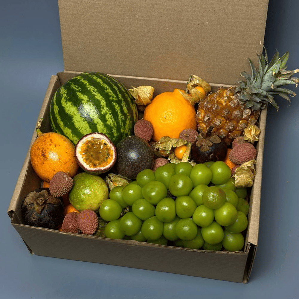 Коробка, полная неожиданностей: каждый фрукт — новое открытие. Для тех, кто ценит яркие вкусовые впечатления. Арбуз мини – 1 шт. Папаган – 1 шт. Ананас мини – 1 шт. Гранадилла – 1 шт. Маракуйя красная – 3 шт. Маракуйя зеленая – 1 шт. Мангостин – 1 шт. Виноград шайн мускат – 1000 гр. Личи – 125 гр. Физалис – 3 шт. Прекрасная подарочная упаковка и открытка с вашими пожеланиями.