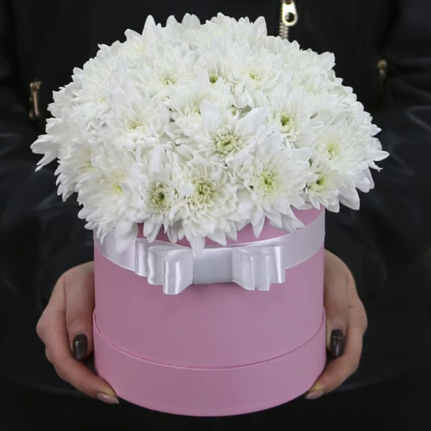 Шляпная коробка с цветами «Элегантная коробка с хризантемами»