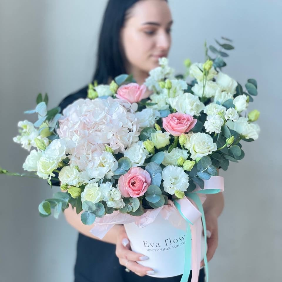 Нежный и романтичный вариант , в который входят гортензия для создания объема и яркости, маттиола абрикосовая для добавления нежности и аромата, эвкалипт для придания свежести и текстуры, роза пион...