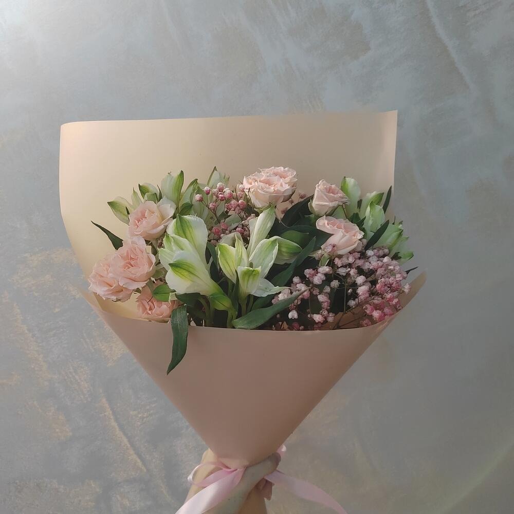 Этот изысканный букет состоит из элегантных роз, нежных альстромерий, гипсофилы. рускуса.Он упакован в стильную дизайнерскую упаковку, которая подчеркивает его изысканный вид и делает его идеальным подарком для любого случая. Уход за срезанными цветами. Налейте в чистую большую вазу много прохладной воды. Подрежьте цветы секатором или острым ножом под углом 45°C и поставьте цветы в воду. Цветы не любят жару, сквозняк или холод, а также прямого солнца. Не ставьте букет или композицию у батареи, под кондиционером или на подоконнике, возле фруктов. Раз в день нужно менять воду . Чтобы цветы дольше простояли, ежедневно подрезайте стебли цветов. Все букеты сделаны нашими флористами. Цветы - это живой организм, они всегда разные. Поэтому даже букеты со 100% одинаковым составом будут различаться.