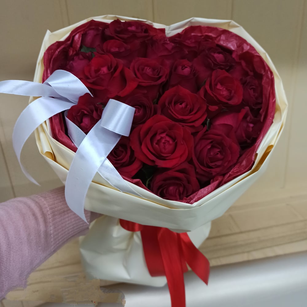 Букет роз в форме сердца. Выполнен на каркасе. Цвет роз и упаковки можно оговаривать с флористом.