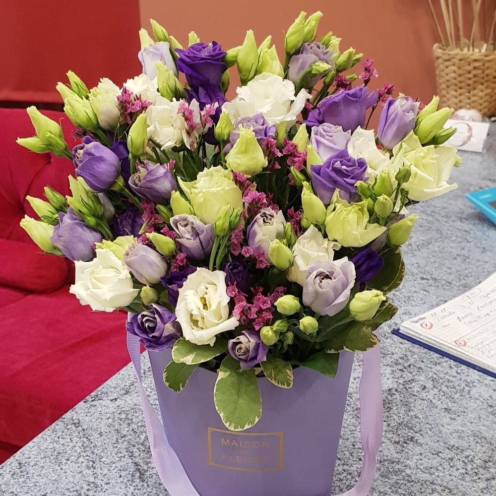 Коробка с цветами «Эустома в кашпо»