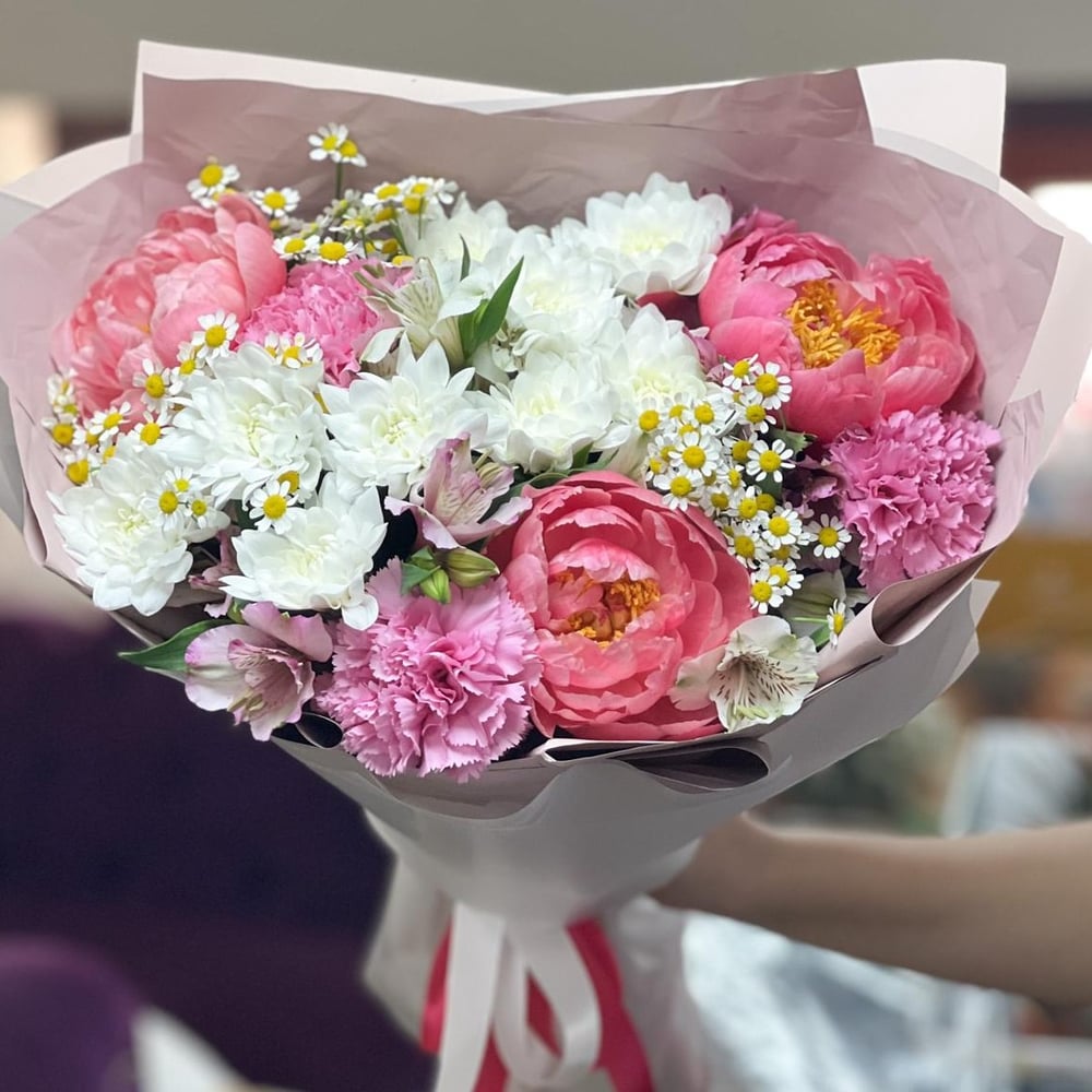 Букет «Евелина» из ромашек и пионов