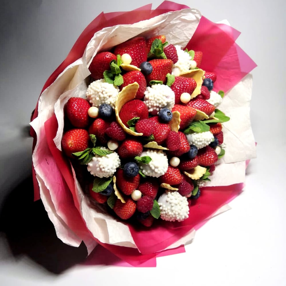 Очередная новинка! Букет Фанни на 40-45 ягод клубники. В чём его фишка? 1) в составе - сахарная вафелька 2) рисовые шарики сейчас не только на клубнике в шоколаде, но и вразброс по букету, более крупные и очень вкусные 3) естественно, этот букет может преобразиться от Ваших пожеланий маршмеллоу, малина, голубика и ежевика, клюква в сахаре и много чего ещё изумительно впишется в этот букет всего за 500₽, Просто укажите в комментарии к заказу, и мы выставим доплату