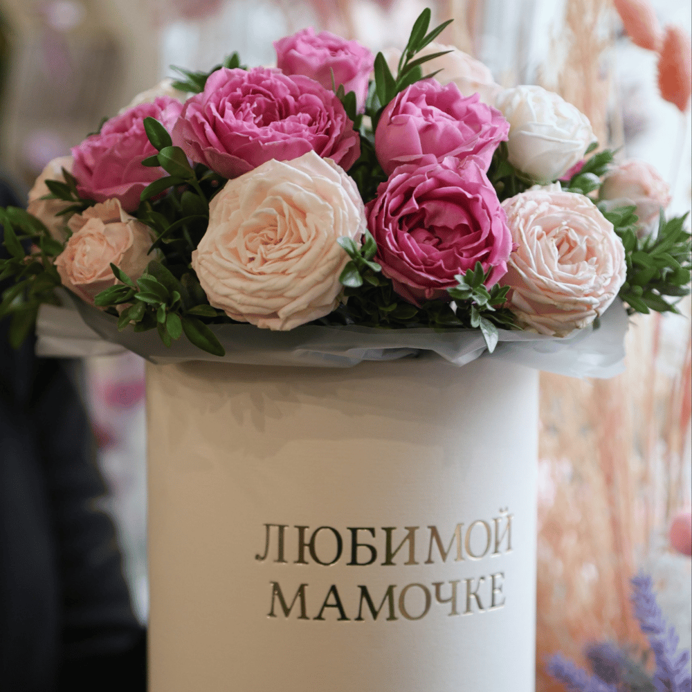 Пионовидные розы в шляпной коробке с добавлением зелени