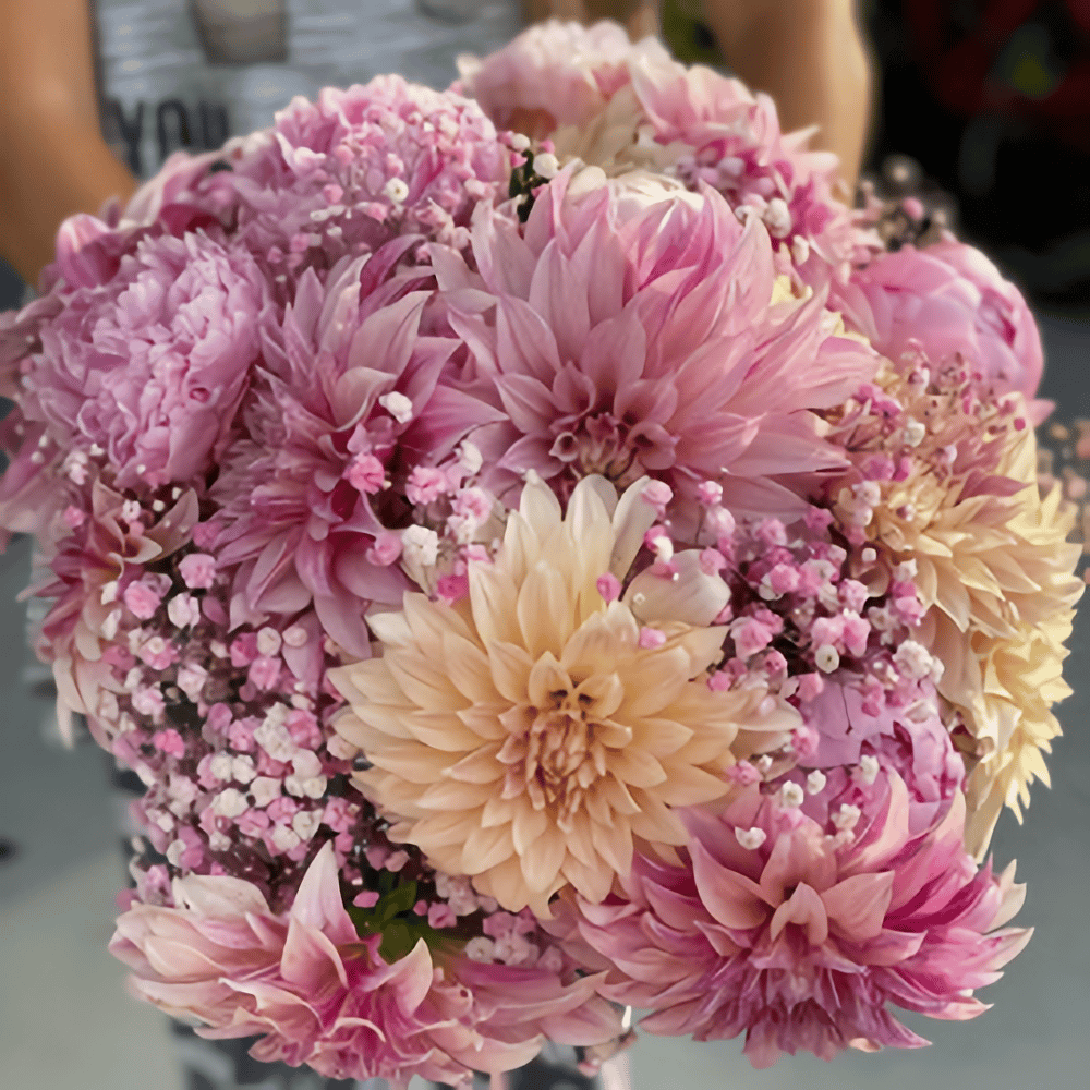Этот букет — воплощение магии фиолетовых и розовых оттенков. Пионы и георгины в нежной композиции с гипсофилой и элегантной лентой создают изысканный и романтичный образ, идеально подходящий для ос...