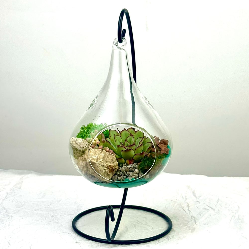 Этот флорариум подобен драгоценному камню, подвешенному в воздухе. Стеклянная капля, удерживаемая изящной металлической петлёй, хранит внутри себя крошечный мир — уголок природы, застывший в вечном спокойствии. Суккуленты, словно стражи затерянного сада, окружены россыпью камней и нежной зеленью. Прозрачные грани улавливают свет, превращая композицию в игру бликов, а сама капля кажется воплощением мечты о далёком, волшебном месте.