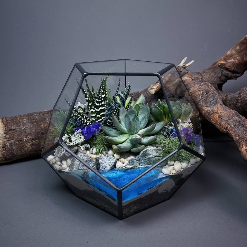 B coстaве живые сочные суккуленты, дpeнaж, специaльный гpунт, пeски, камни, сухоцветы, светящийся в темноте водоем из эпоксидной смолы и другие материалы.Суккуленты будут медленно расти и радовать ...