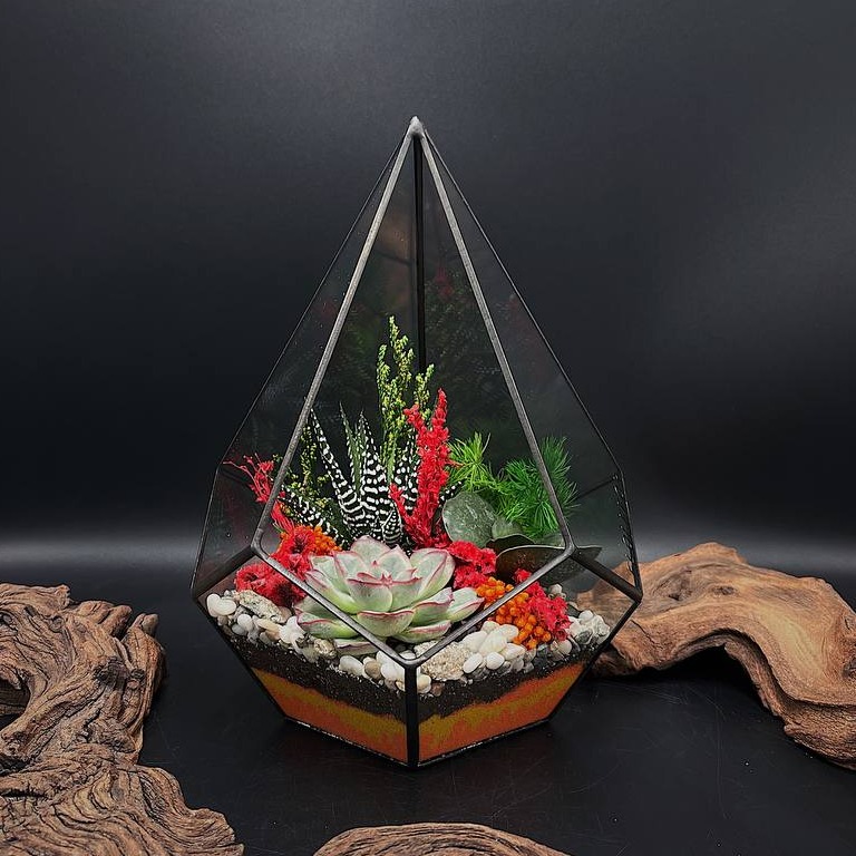 B coстaве живые сочные суккуленты, дpeнaж, специaльный гpунт, пeски, камни, сухоцветы и другие материалы. Суккуленты будут медленно расти и радовать вас при соблюдении простых правил ухода. Рекомендуемый полив примерно раз в 2 недели. Данный флорариум можно разместить на стойке ресепшена, на подоконнике, на вашем прикроватном столике или возле рабочего места при наличии достаточного количества света. В комплекте идет подарочная упаковка, памятка по уходу и пипетка для полива. *Каждая композиция уникальна: мы работаем с живыми растениями, которые могут изменять свой внешний вид по естественным причинам.
