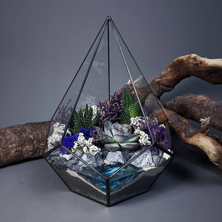 B coстaве живые сочные суккуленты, дpeнaж, специaльный гpунт, пeски, камни, сухоцветы, искусственный водоем из эпоксидной смолы и другие материалы. Суккуленты будут медленно расти и радовать вас...