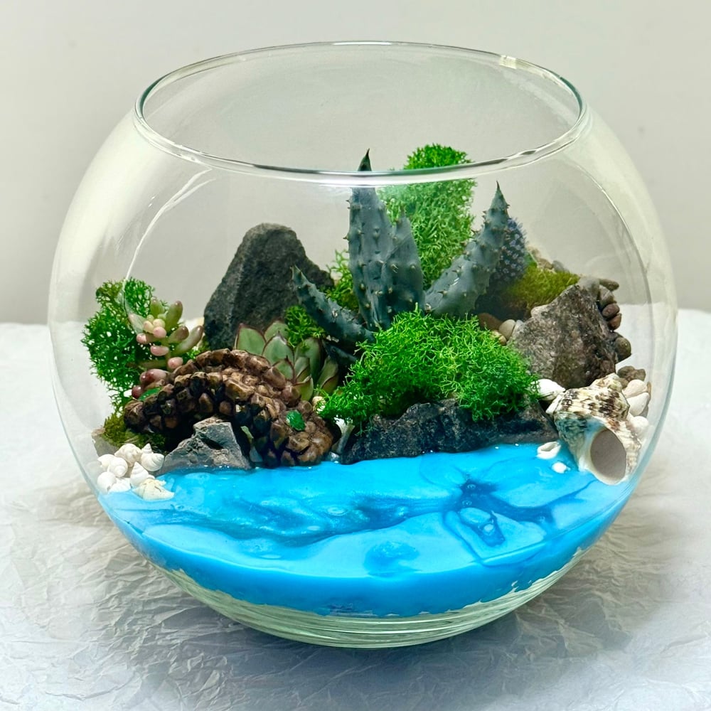 Флорариум "Синяя Этот флорариум — словно миниатюрный сон о далёком острове, затерянном в бирюзовых водах. Суккуленты, будто экзотические стражи, охраняют скалистые берега, а мох шепчет о лесных тро...
