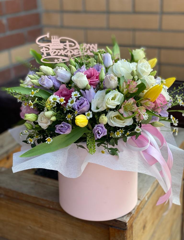 Шляпная коробка с цветами «Флоренси» из эустом и тюльпанов