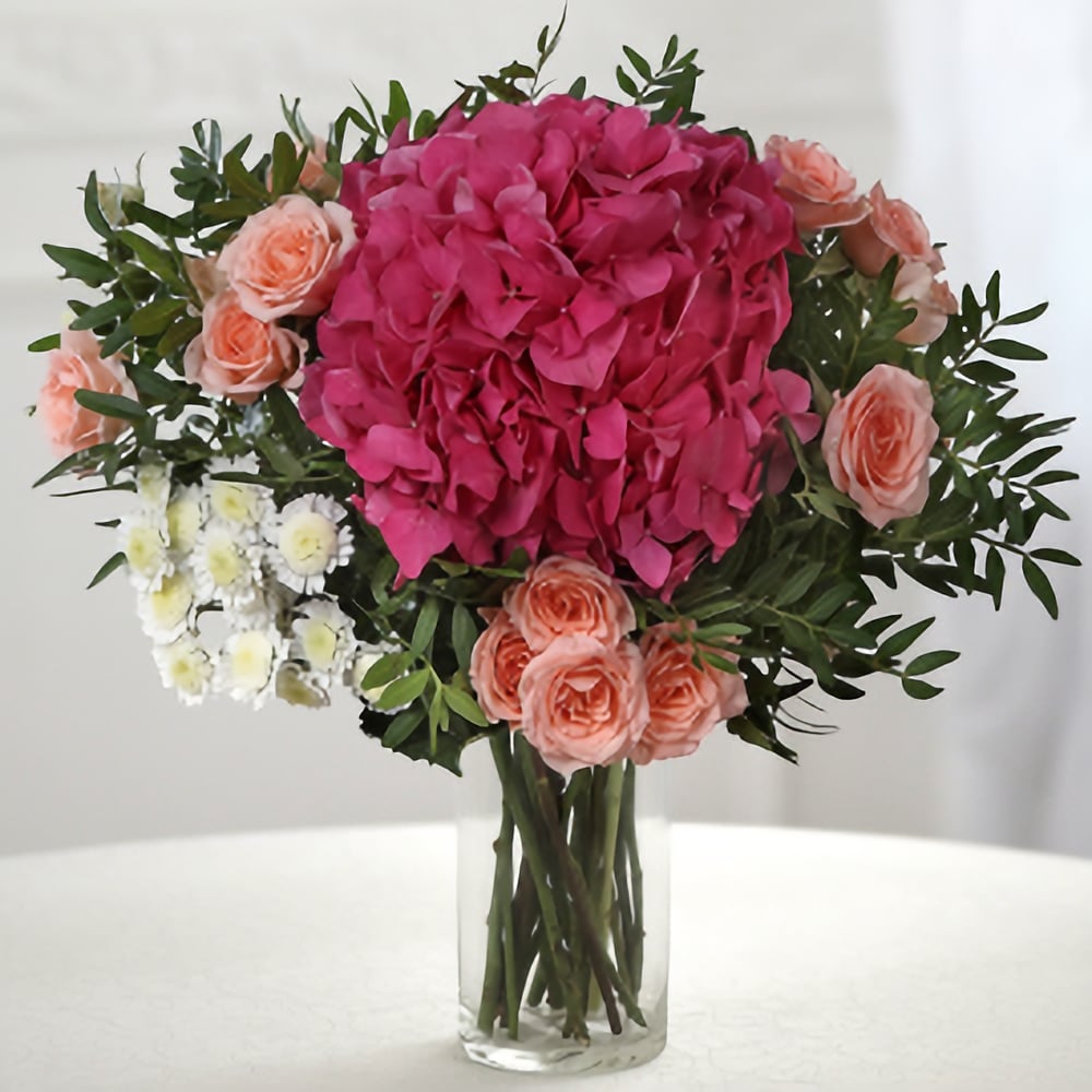 Метельчатая гортензия, в обрамлении из нежнейших роз, составляет поистине завораживающую женственную композицию. Та, у кого будет этот букет, словно гортензия, окажется в центре внимания.