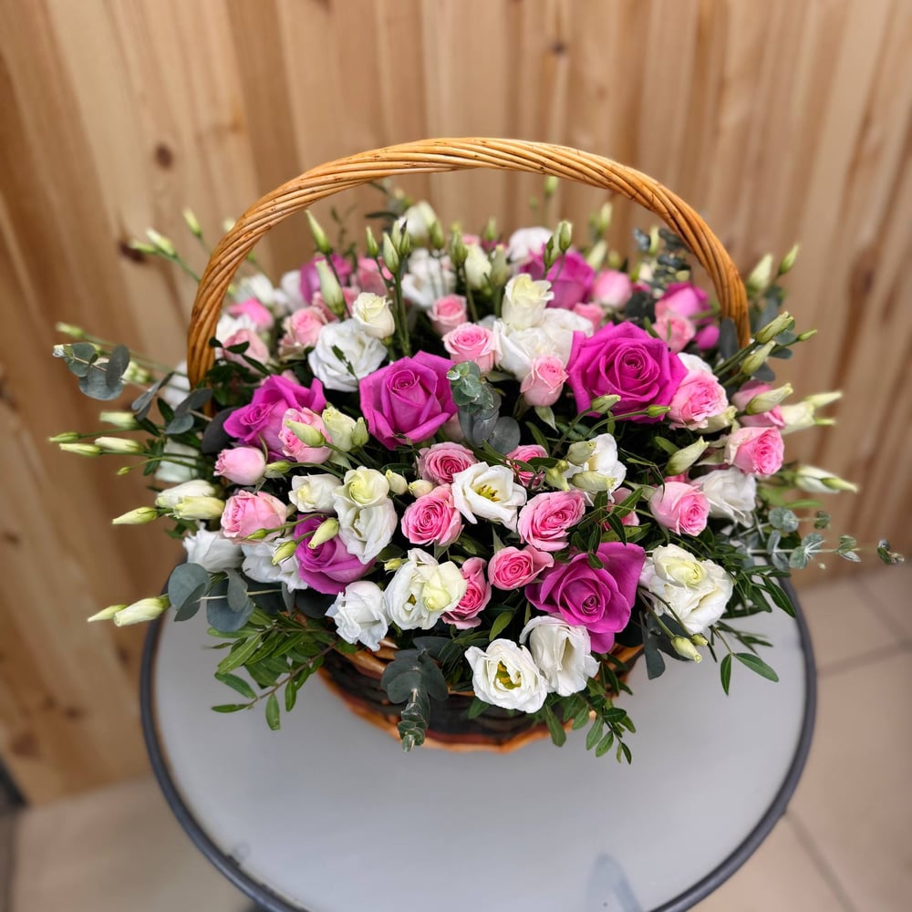 Большая корзина из нежных роз и чувственных лизиантусов, будет радовать глаз и украшать любой интерьер! Прекрасный выбор для любого события, и конечно для прикосновения к сердцу близкого человека! ...
