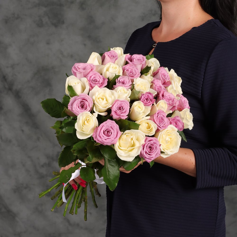 Классический букет из 35 белых и розовых роз. Сорт: Аква, Аваланж Упаковка: лента.
