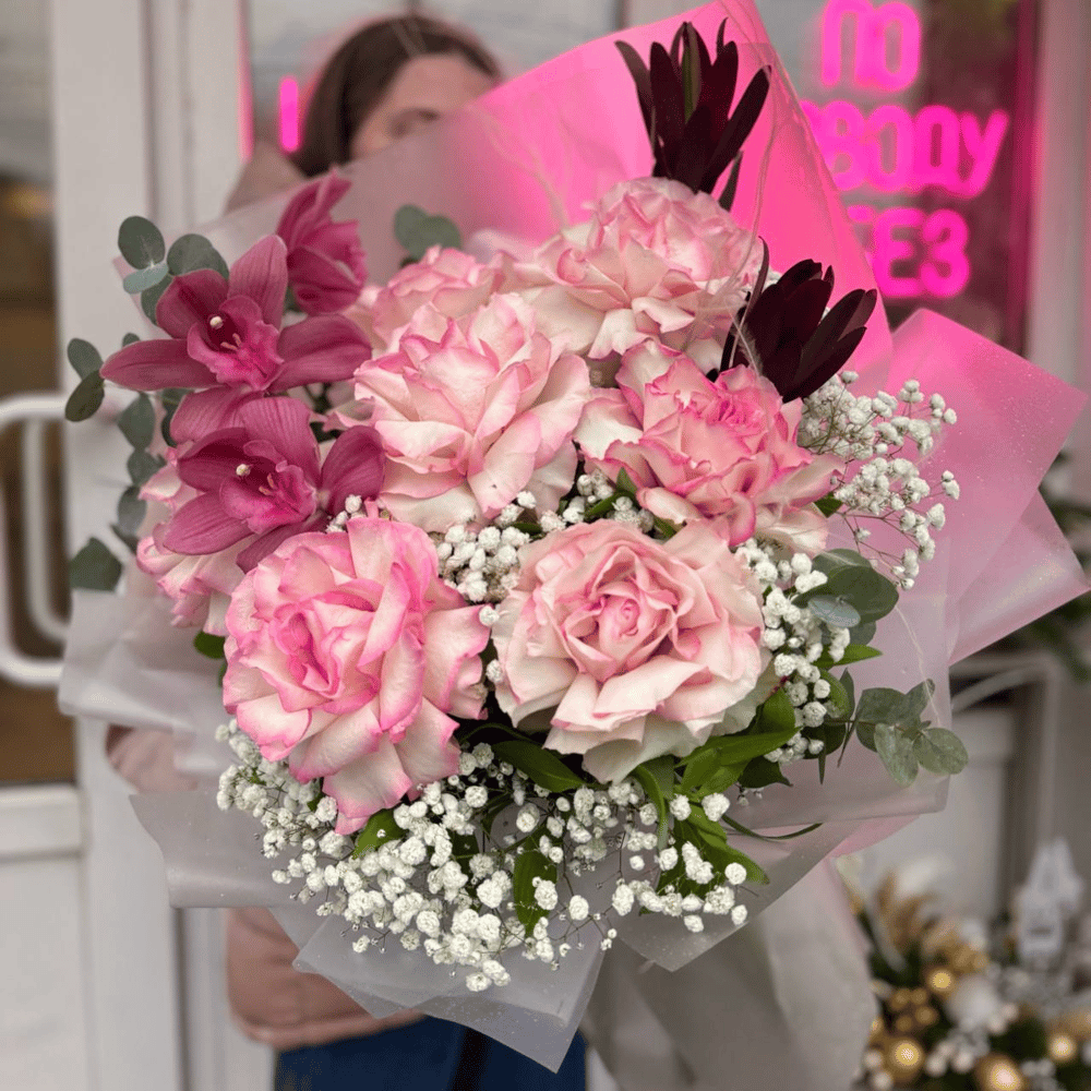 Букет из 7-ми веток Французкой розы, 2 веток гипсфолы с дополнением 2 веток люкодендрона и веткой орхидеи