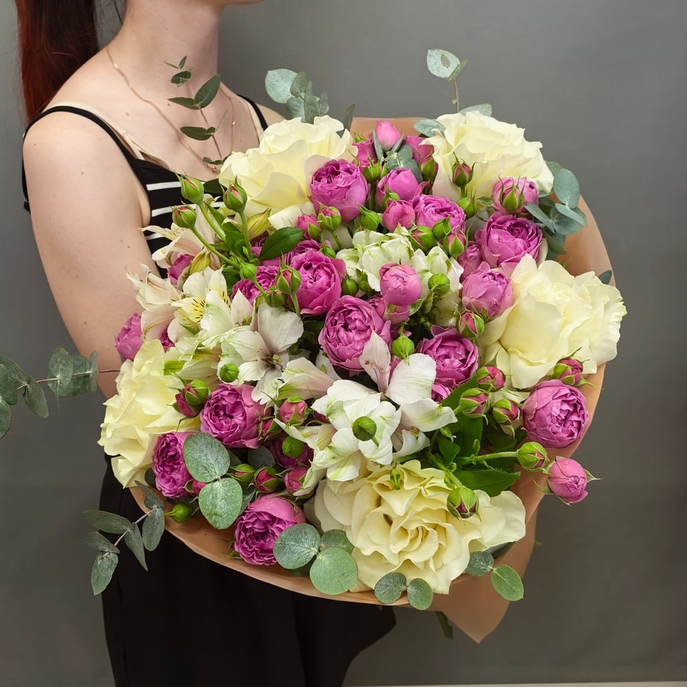 Этот утонченный букет включает в себя красивые белые розы мондиал и розы кустовые, альстромерии и ароматный эвкалипт. Композиция упакована в стильную дизайнерскую пленку, которая добавляет изысканности этому нежному и стильному букету. Он будет отличным подарком для особого человека в вашей жизни.