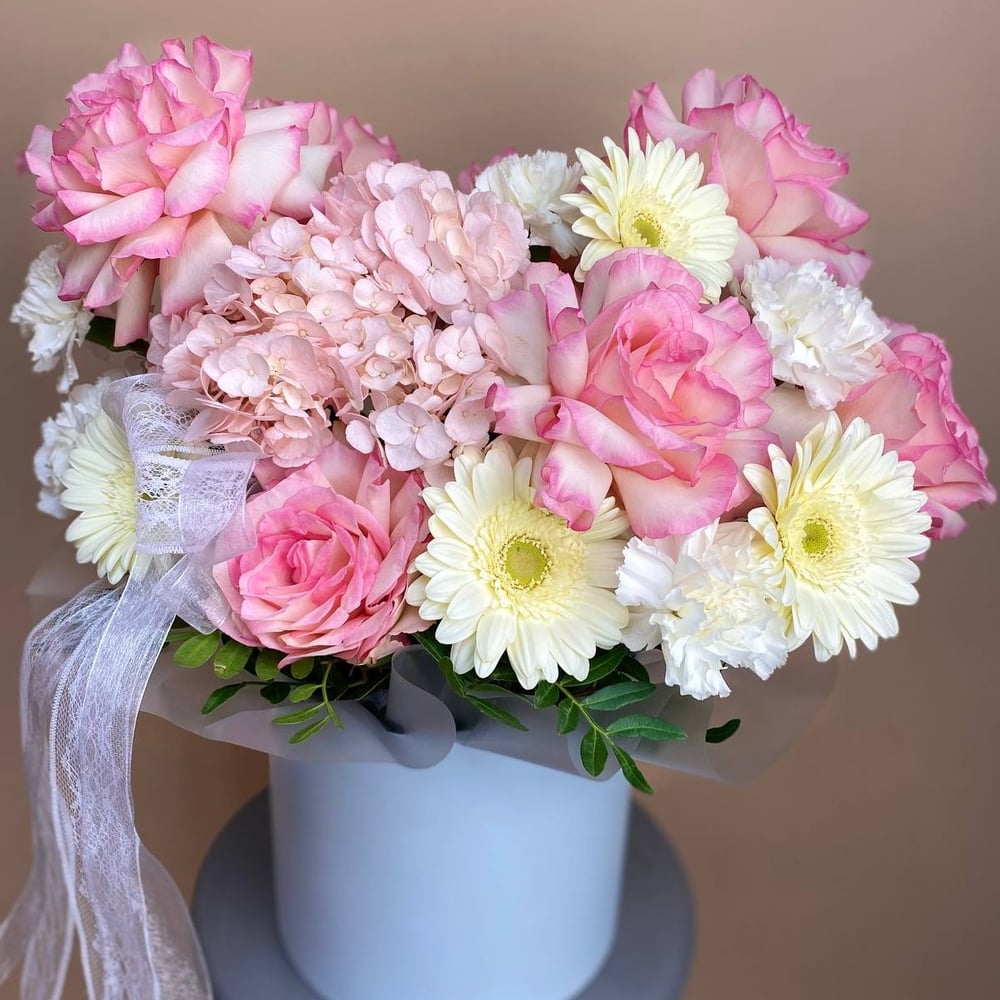 Французские розы и герберы в шляпной коробке