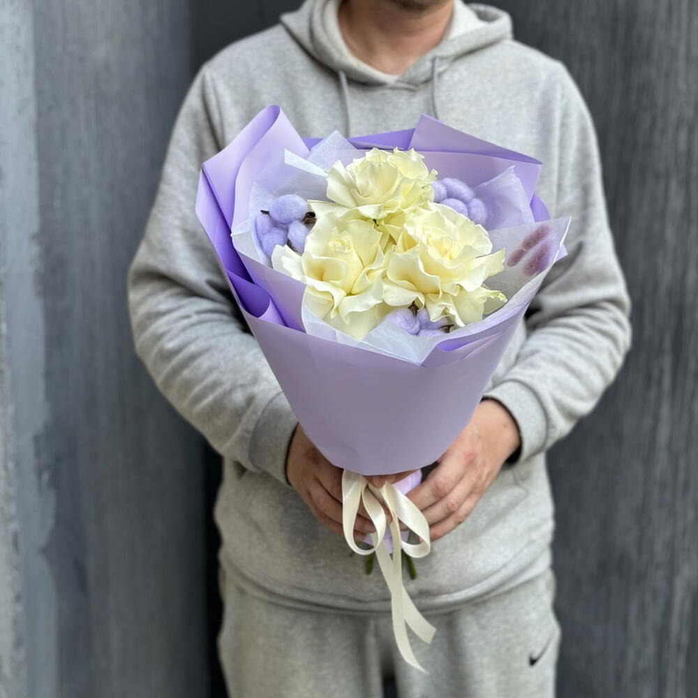 Букет, созданный из изысканных белых французских роз, нежного сиреневого хлопка и элегантного лагуруса, представляет собой воплощение утонченности и гармонии природы. Белоснежная чистота роз символизирует искренность чувств и чистоту намерений, создавая атмосферу свежести и спокойствия. В дополнении к нашим букетам идет Сладкий подарок от магазина