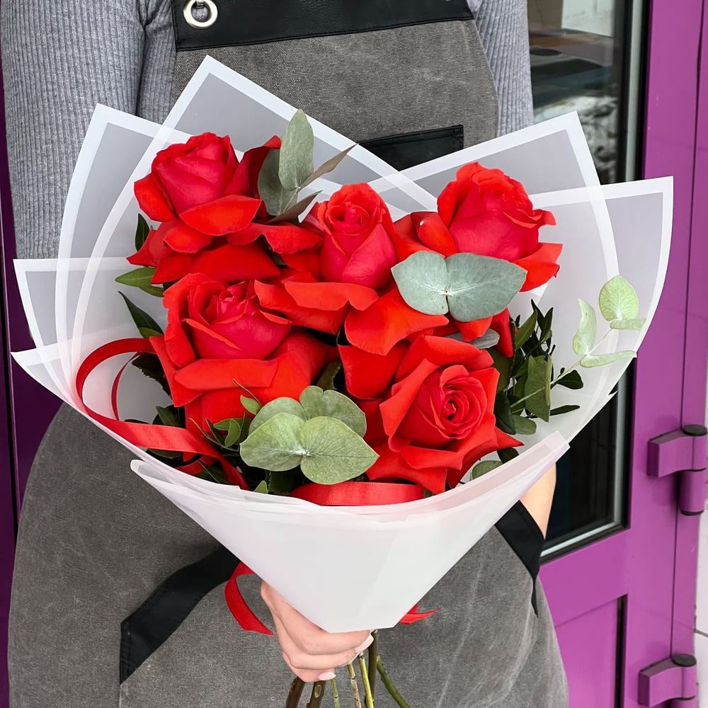 Стильные букет из красных роз с эвкалиптом.
