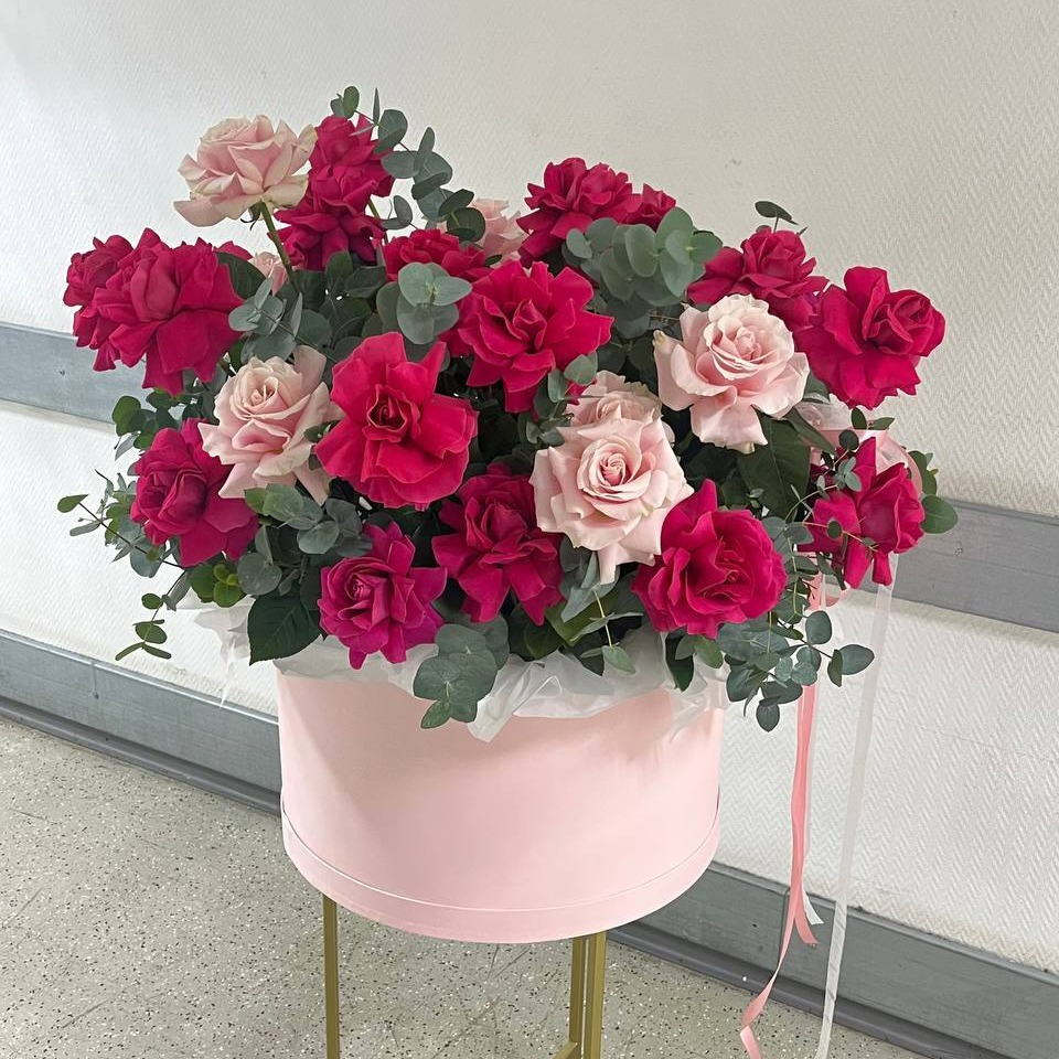 Яркие и Нежно Розовые Французские Розы с Эвкалиптом в Шляпной Коробке Погрузитесь в мир утонченной красоты с нашей эксклюзивной композицией из ярких нежно розовых французских роз, дополненных свежими веточками эвкалипта. Эти великолепные цветы, собранные с любовью, создадут атмосферу уюта и романтики в любом интерьере. Почему стоит выбрать нашу композицию? 🌹 Элегантность и стиль: Каждая роза — это произведение искусства, символизирующее любовь и нежность. Их насыщенный цвет и изысканная форма привнесут в ваш дом нотки утонченности. 🌿 Аромат свежести: Веточки эвкалипта не только добавляют композиции оригинальности, но и наполняют пространство свежим, расслабляющим ароматом, способным поднять настроение. 🎁 Идеальный подарок: Эта шляпная коробка станет прекрасным подарком для близких на любой случай — будь то день рождения, юбилей или просто знак внимания. 📦 Удобная упаковка: Мы заботимся о каждом элементе.