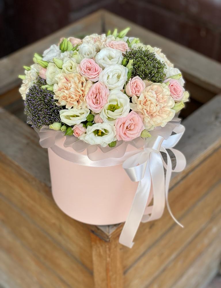 Шляпная коробка с цветами «Френдс» из эустом и гвоздик