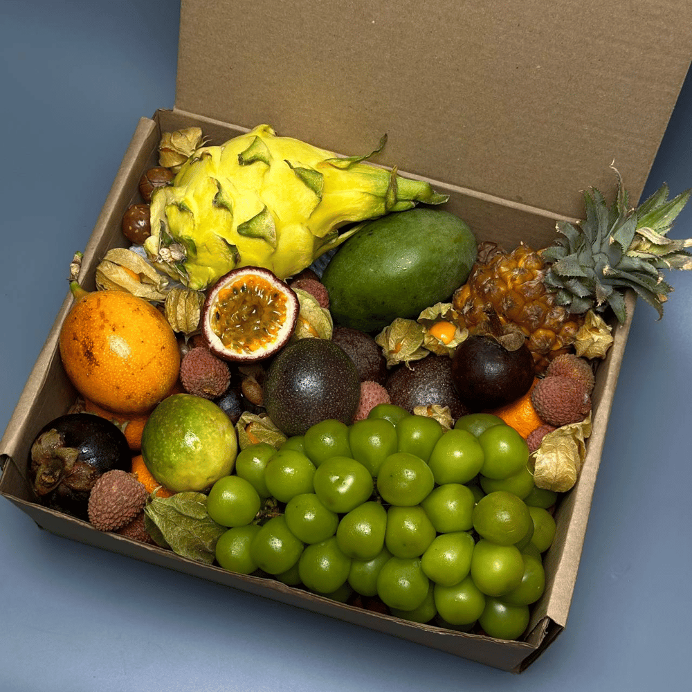 Собрание редких даров природы — от бархатистой питахайи до ароматной маракуйи. Подарите себе кусочек тропического рая. Состав: питахайя желтая – 1 шт. Маракуйя красная – 3 шт. Манго египет – 1 шт. Ананас мини – 1 шт. Гранадилла – 1 шт. Мангостин – 3 шт. Мандарин – 3 шт. Физалис – 3 шт. Личи – 125 гр. Орехи макадами – 125 гр. Виноград шайн мускат – 1000 гр. Прекрасная подарочная упаковка и открытка с вашими пожеланиями.