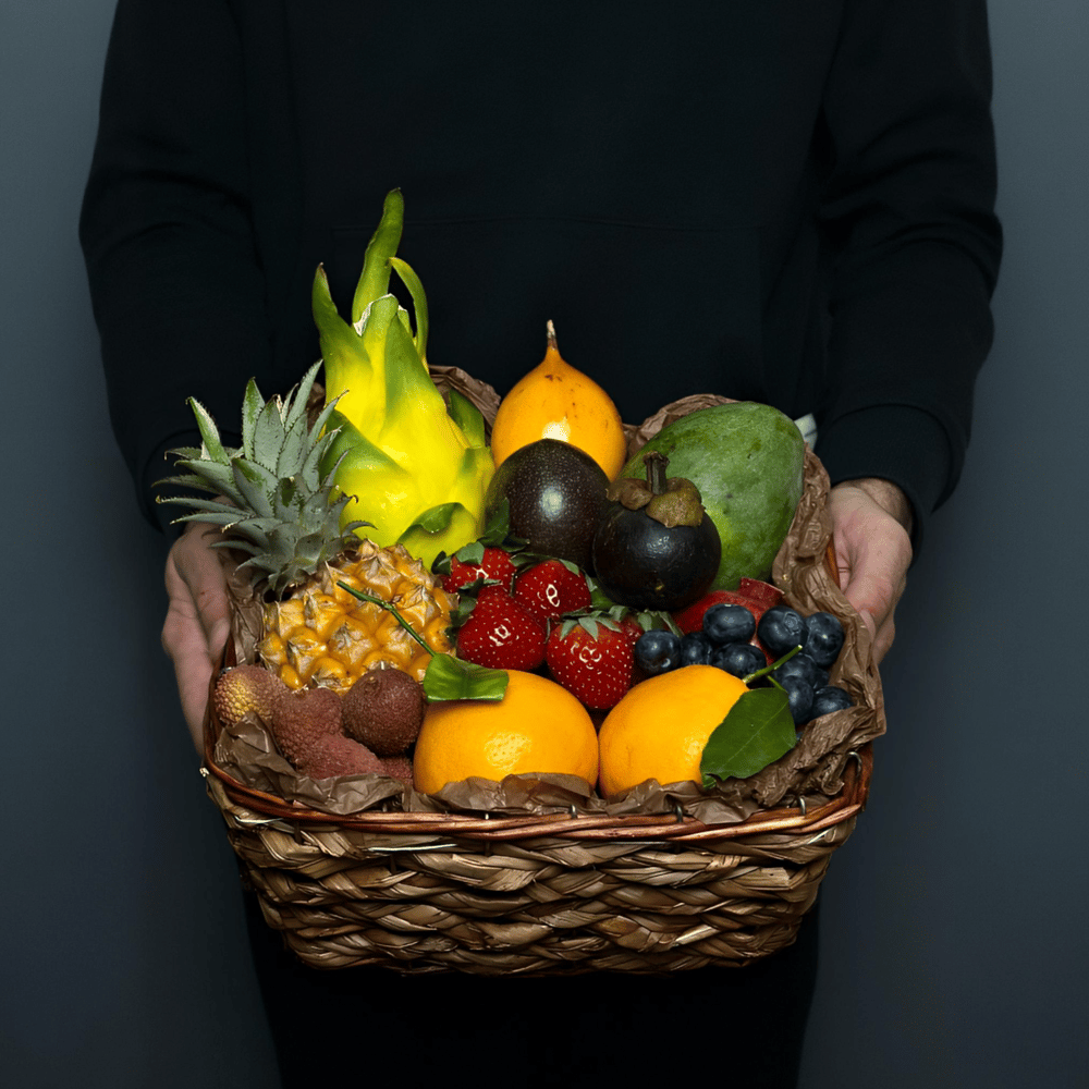 Фруктовый букет в элегантной корзине — идеальное сочетание вкуса и красоты: здесь вы найдёте отборные экзотические фрукты и сочные ягоды. Такой набор фруктов превратит любой праздник в маленькое тропическое приключение. Состав: желтый драгон фрукт (питахайя) – 1 шт. Гранадила – 1 шт. Манго египет – 1 шт. Маракуйя красная – 1 шт. Маракуйя зеленая с кислинкой – 1 шт. Мангостин – 1 шт. Гранат-мини. – 1 шт. Папаган – 2 шт. Клубника – 100 гр. Голубика – 100 гр. Личи – 100гр. Прекрасная подарочная упаковка и открытка с вашими пожеланиями.