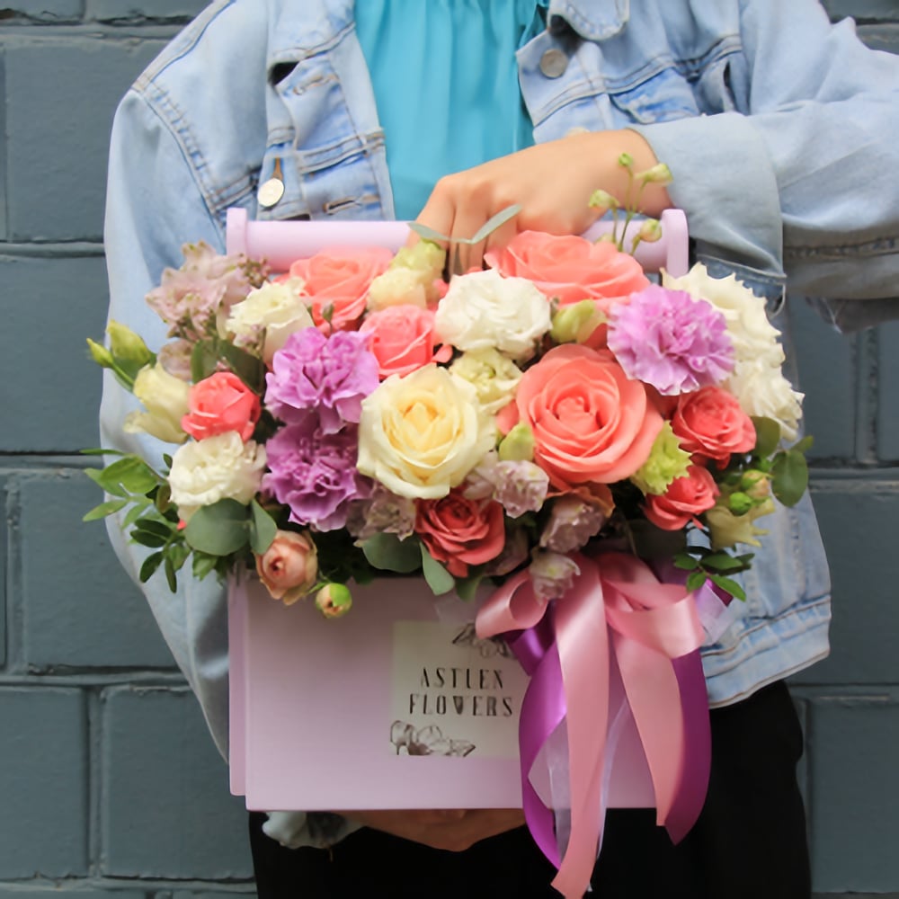 Яркая композиция в ящике подойдет для подарка на любой случай