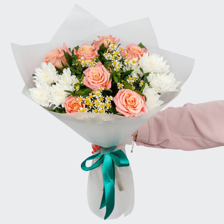 Белые хризантемы и светлые кораллово-розовые розы соединяются в букете, как два сердца, что которые нашли друг друга. Их сочетание создает атмосферу спокойствия и тепла, наполняя пространство атмосфе…