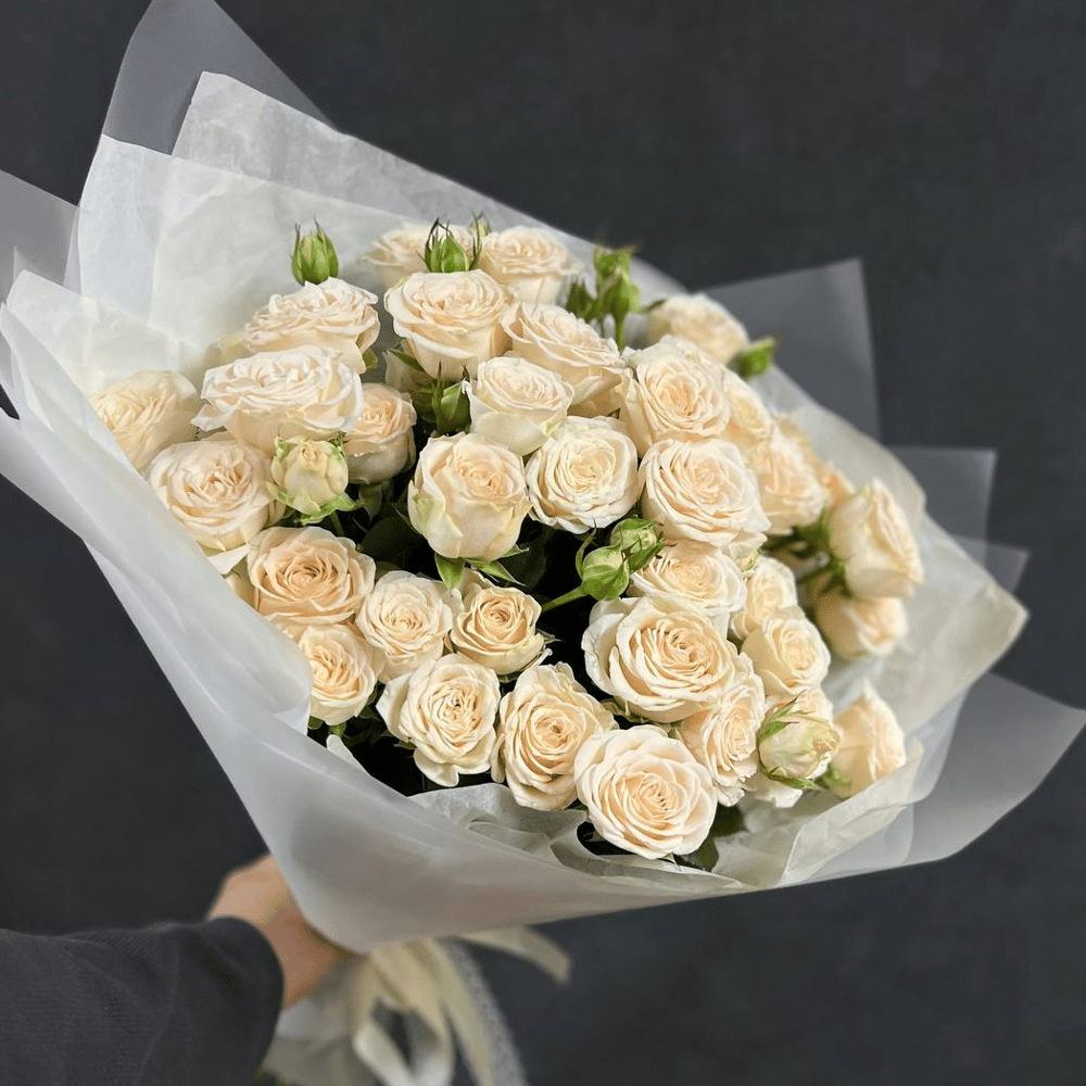 Элегантный букет из кремовых кустовых роз — воплощение нежности и утончённости. Пышные бутоны, собранные в компактную, но объёмную композицию, создают ощущение лёгкости и изысканности. Нежный кремовый оттенок роз придаёт букету особую теплоту и романтичность, делая его универсальным подарком для любого случая — от дня рождения до свадьбы. Цветы аккуратно упакованы в полупрозрачную белую бумагу, которая подчёркивает их естественную красоту и добавляет композиции завершённости. Лёгкая, воздушная упаковка создаёт ощущение лёгкости, а аккуратная лента завершает образ, придавая букету законченность. Идеальный подарок Маме, Жены ,Бабушке, Сестре, Подруге, знакомой или Коллеге. Подходящий подарок на День Рождения, Юбилей, Свадьбу, Мероприятие или без повода. Инструкция по уходу: 1. Обновите срез букета (секатором или ножом срежьте стебли на 1 см под углом 45 градусов). 2. Поставьте цветы в вазу с холодной водой 3. Меняйте воду в вазе каждый день, а срез обновляйте раз в 1–2 дня.