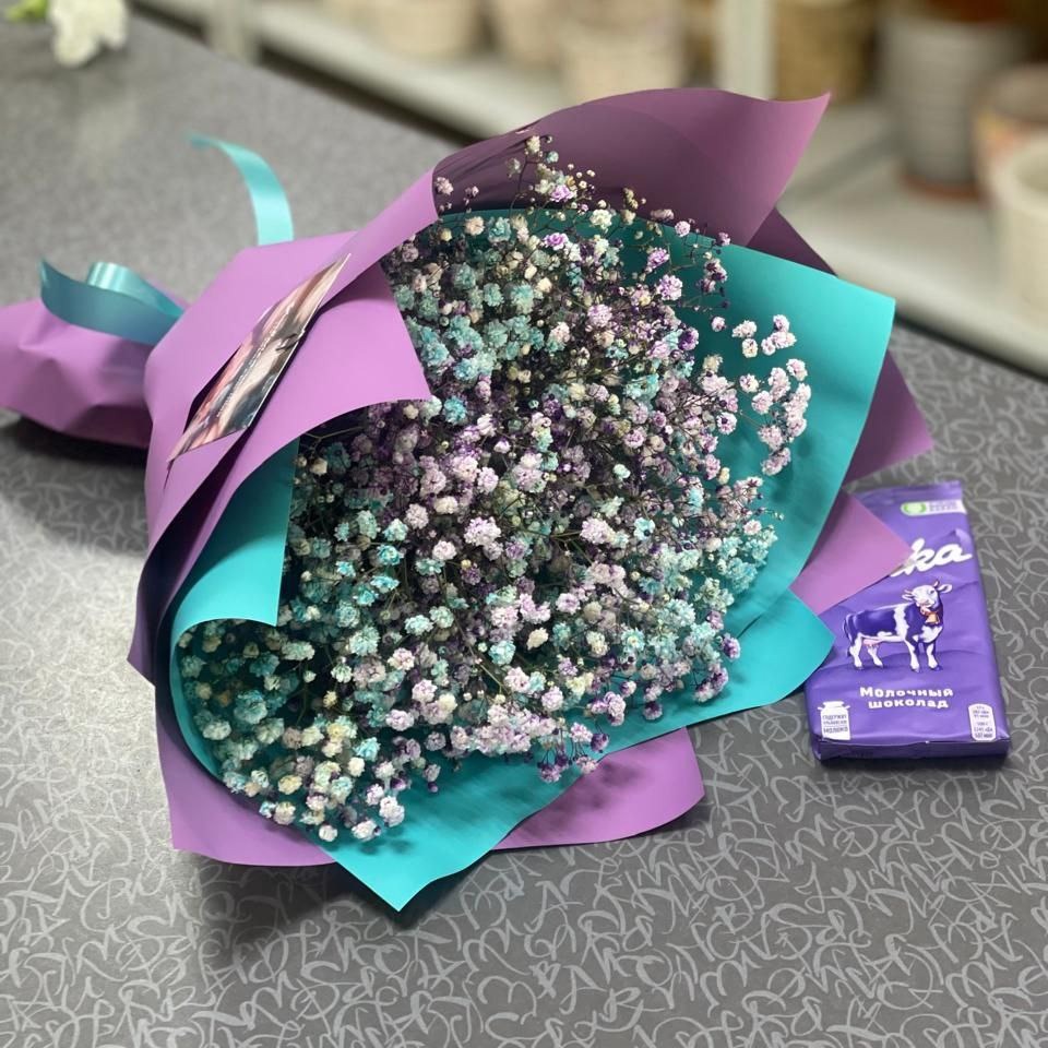 Букет из стойких гипсофил и шоколада порадует любого получателя и поднимет настроение!
