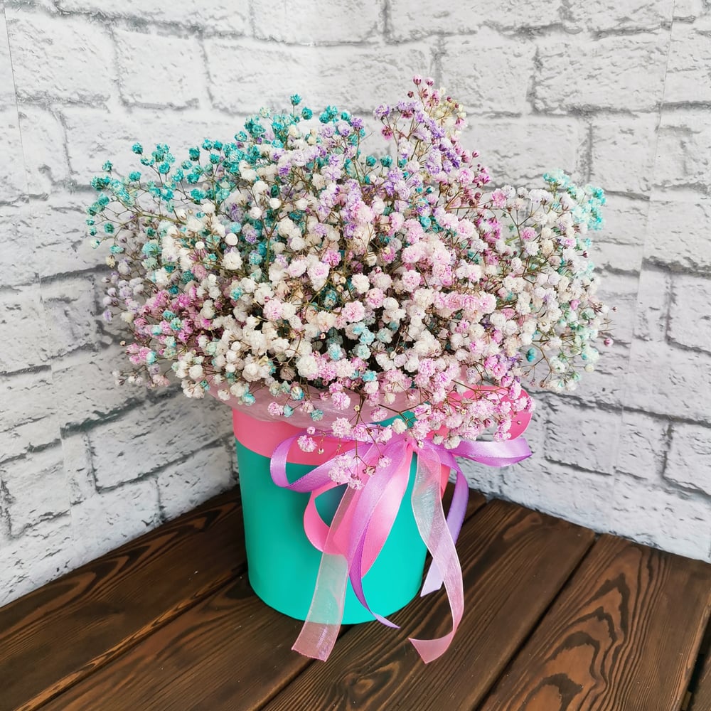 Шляпная коробка 14*15 см, гипсофила разноцветная, лента атласная