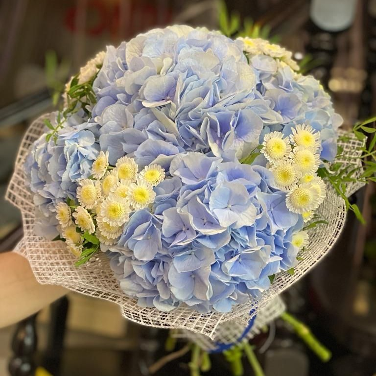 Великолепный, яркий, стильный букет с чудесной голубой гортензией