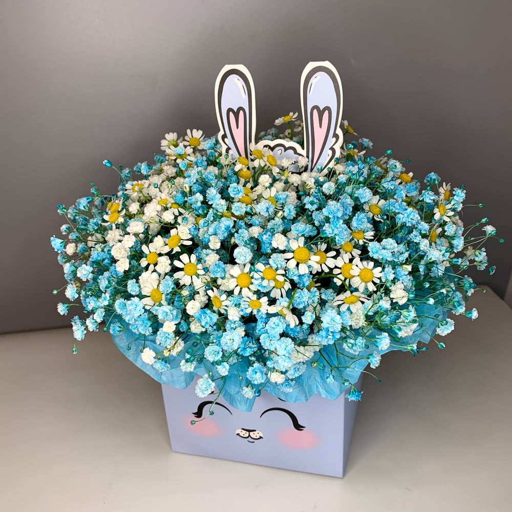 Нежная композиция из голубой гипсофилы и полевых ромашек в коробке Зайка 💙