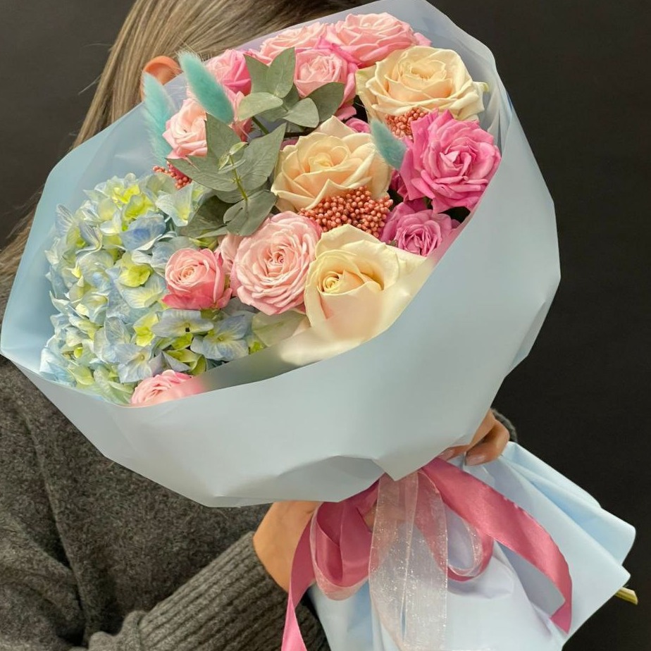 Букет «Голубая лагуна» из роз и гортензий