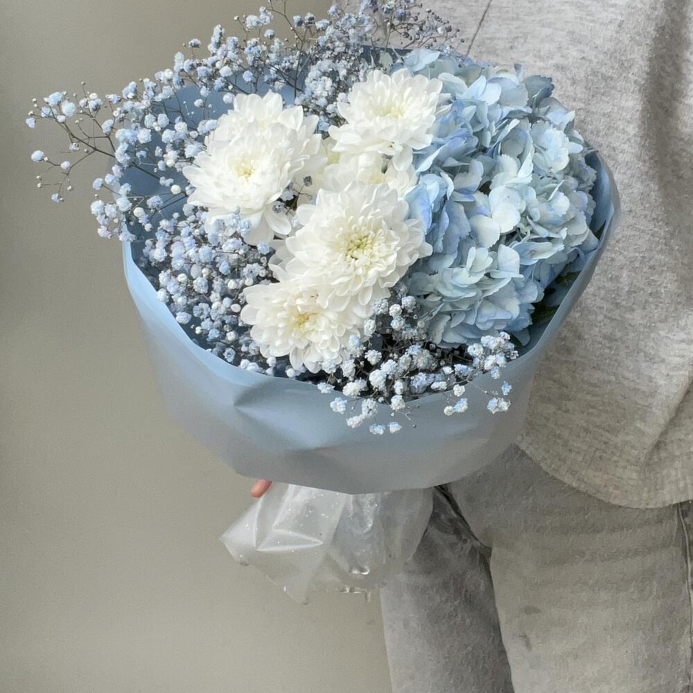 Невероятно воздушный букет собранный из гортензии , кустовой хризантемы и пышной гипсофилы.