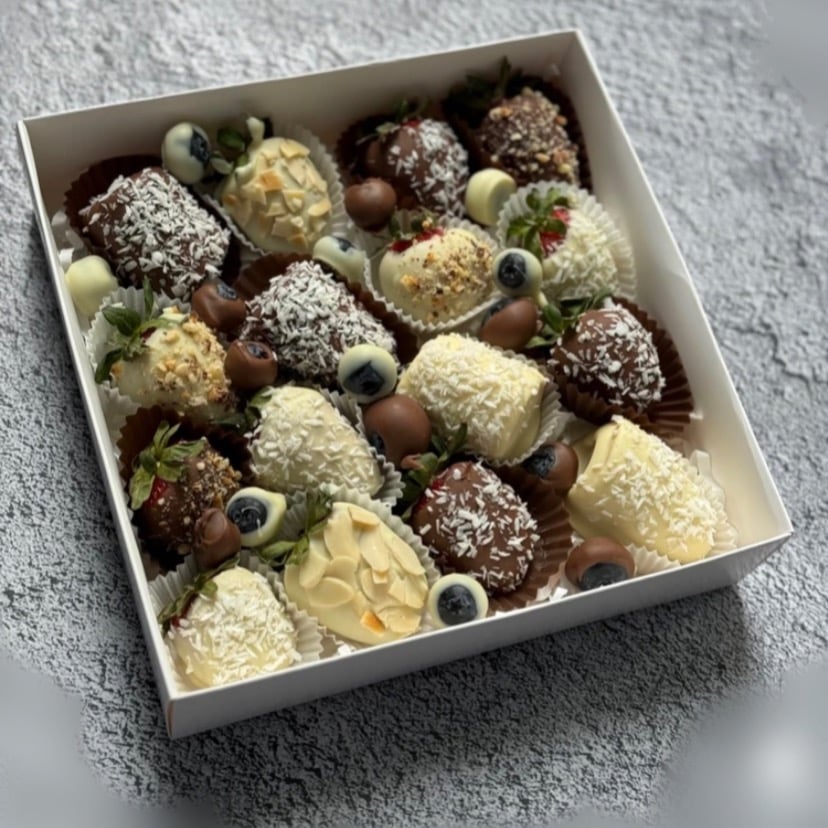 Голубика,клубника,бананы в шоколаде С кокосовой стружкой,миндальными лепестками и дробленым миндалем