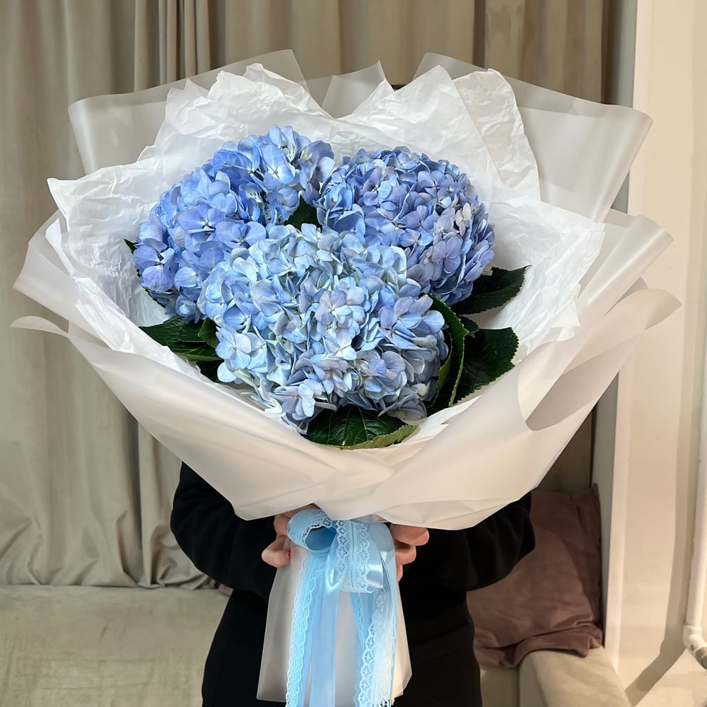 Прекрасный букет, состоящий из трех нежных гортензий (гидрангий) в голубых оттенках. Цветы уложены с любовью в оригинальную дизайнерскую упаковку, что делает этот букет изысканным и стильным подарком для любого повода. Гортензии символизируют благополучие, изобилие и благополучие, поэтому этот букет будет отличным подарком для близких и дорогих людей.