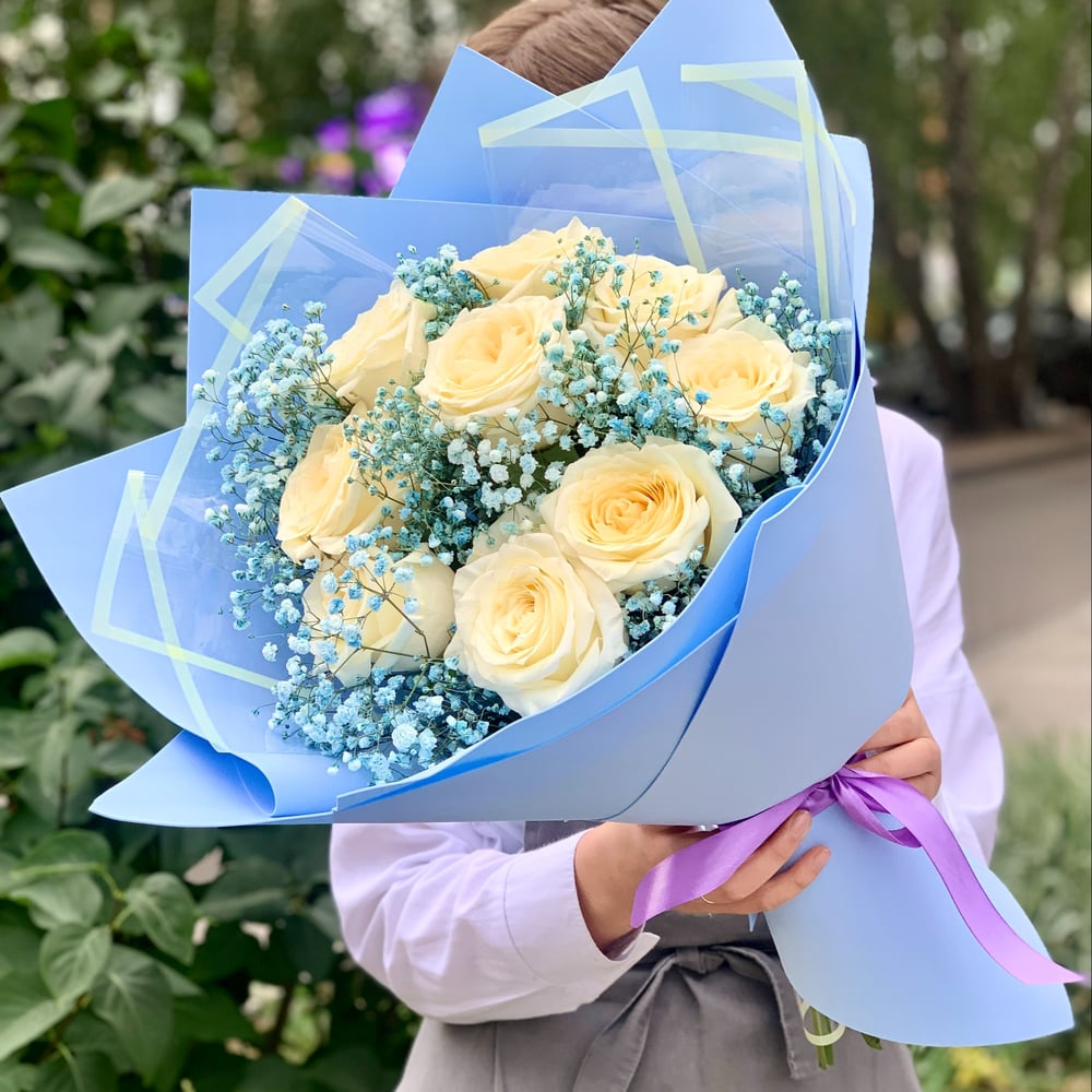 Голубой букетик из роз и гипсофил